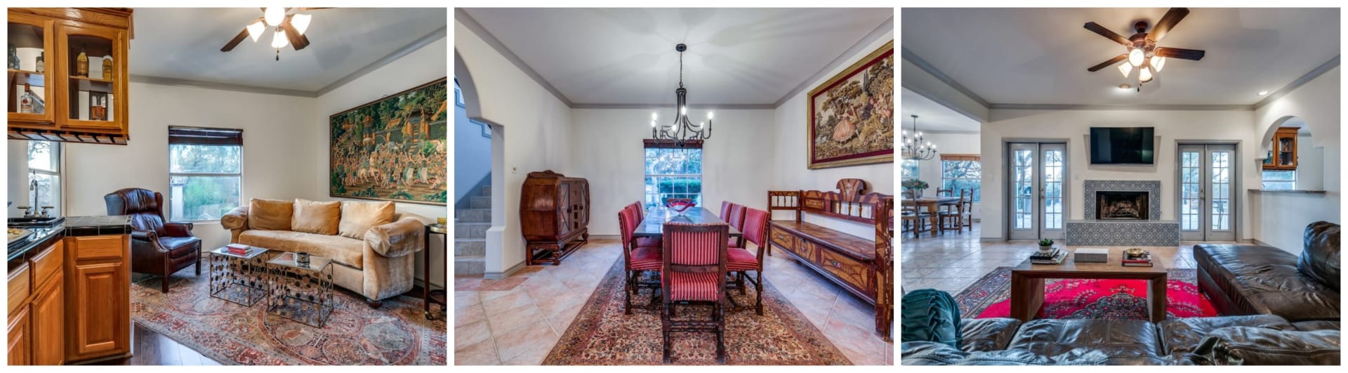 Prominent arches, decorative tile work, and ornate details grace the main house, which features a formal dining room, gourmet kitchen with breakfast area, a light-filled living room with a wood-burning fireplace, a cozy den including a wet bar, and a first-floor guest suite with private outdoor access.