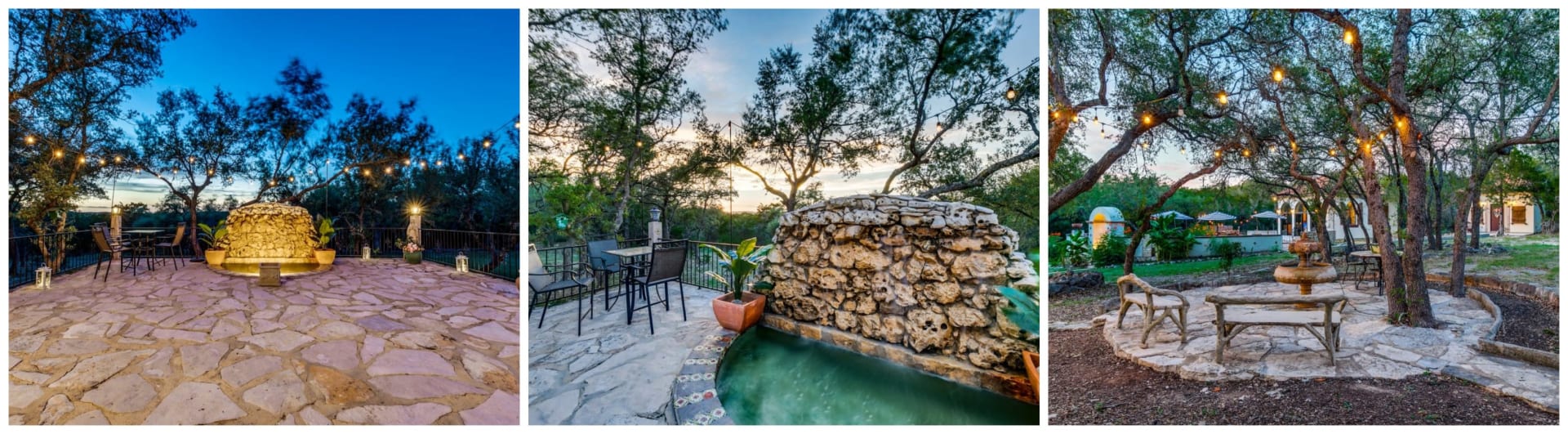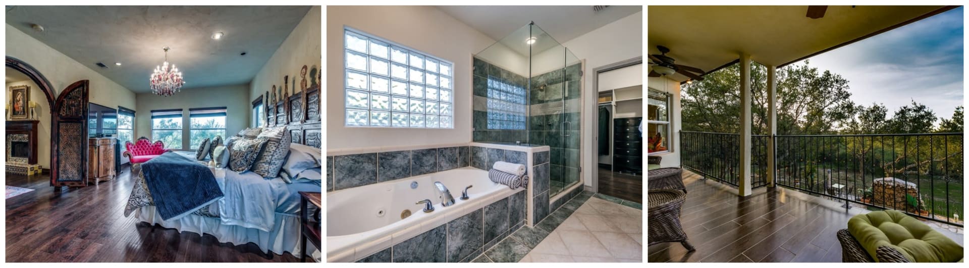 After a long day, escape into the luxurious primary suite, which features an intimate sitting room with a mosaic tile fireplace, spa-like en suite bath, and a private balcony overlooking the property with long-distance hill country views as the backdrop.